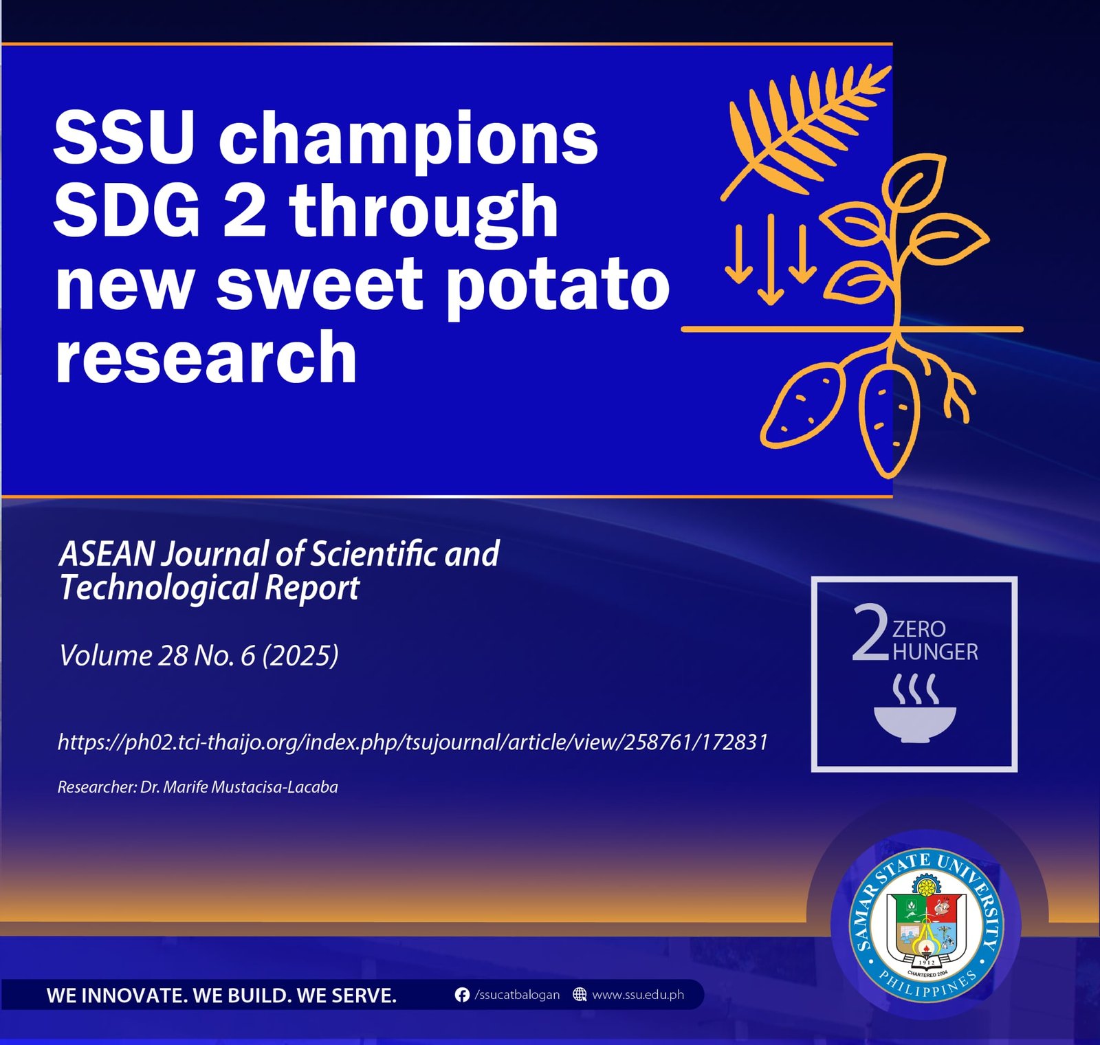 CATBALOGAN CITY, Philippines— In support of the global goal to ensure food security, agricultural productivity, and sustainable farming practices, Samar State University (SSU) champions the Sustainable Development Goal 2 (Zero Hunger) through the study, “Impact of Organic Fertilizer from Philippine Tree Fern (Cyathea contaminans) Leaves on Tuber Performance of Sweetpotato,” published in the Scopus-indexed ASEAN Journal of Scientific and Technological Reports. The paper is authored by SSU Professor Dr. Marife Mustacisa-Lacaba.