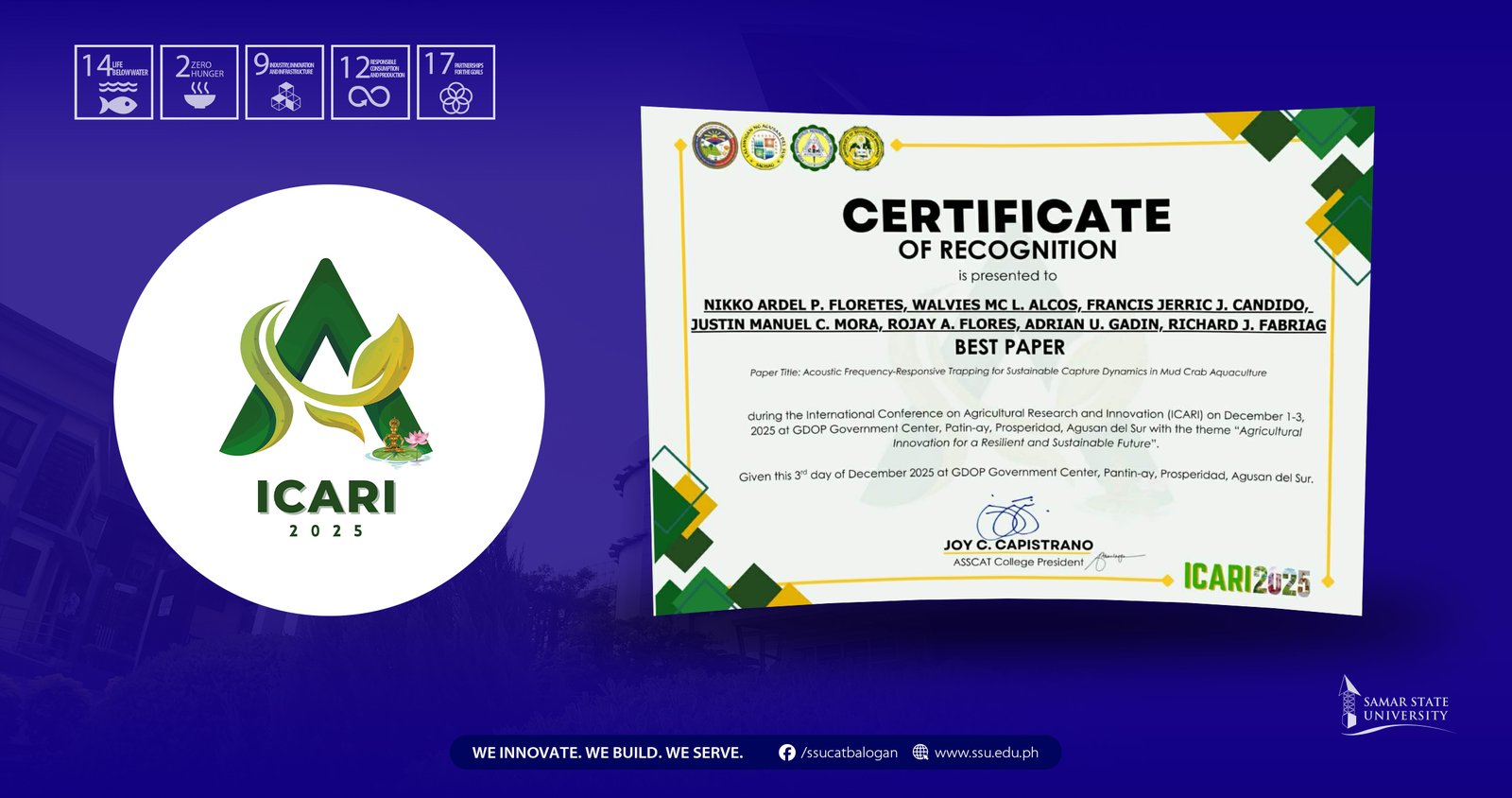 CATBALOGAN CITY, Philippines—Samar State University’s (SSU) research team earned the Best Paper Award at the International Conference on Agricultural Research and Innovation (ICARI 2025) held on December 1-3, 2025, for a study introducing an innovative and sustainable approach to mud crab aquaculture.
