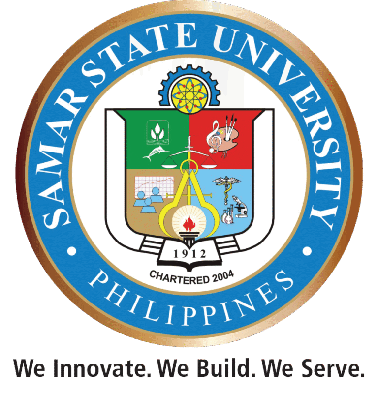 Encircling the whole symbols is the name of the university (Samar State University) and the country (Philippines) in white over sky blue background and outlined in gold, the official colors of the University.