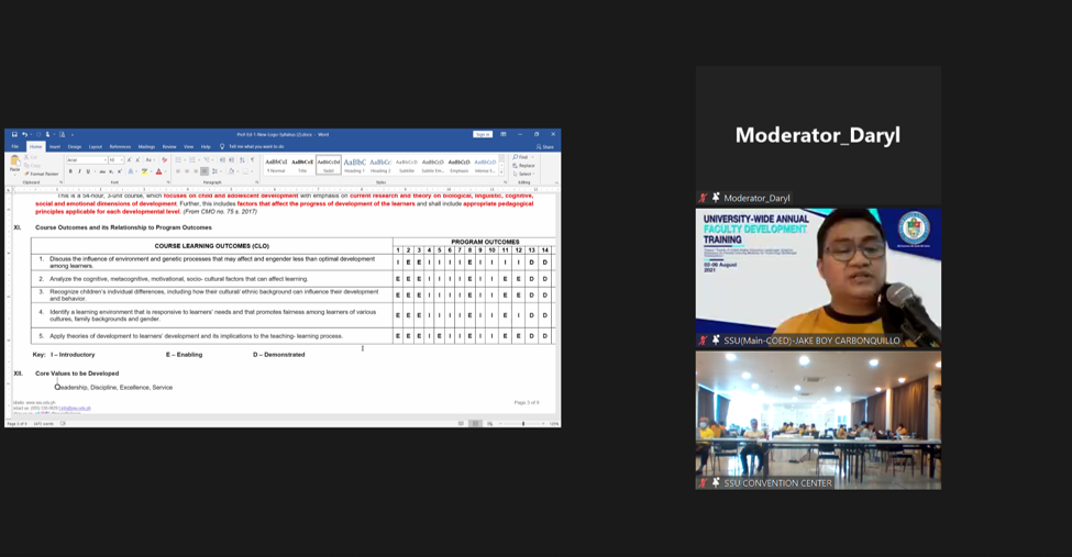 Geared towards building a future-proof curriculum and cultivating a culture of continuous improvement, Samar State University (SSU) faculty representatives from various disciplines submit their syllabi for panel review and critiquing as they presented their outputs during the 4th day of the University-wide Annual Faculty Development Training, August 5 (21) at various venues within the university premises.