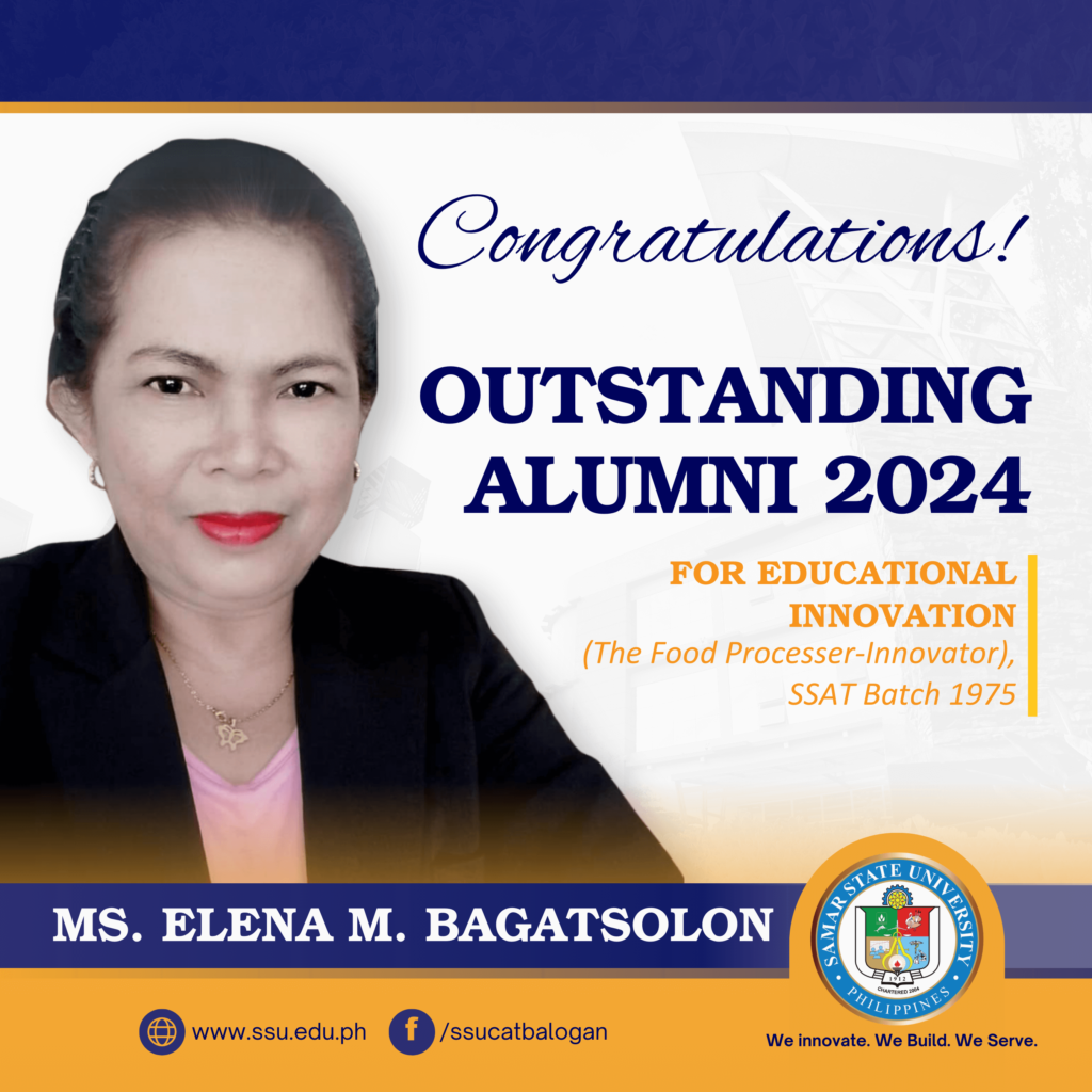 Another awardee is Ms. Elena M. Bagatsolon, the SSU Outstanding Alumna for Educational Innovation. Ms. Bagatsolon is a renowned expert in the field of food processing, and an awardee of the 2021 TESDA Tagasanay Award for her professional achievements and community service. With a 40-year experience in food technology industry, she has made significant contributions and patents for numerous food innovation technologies.