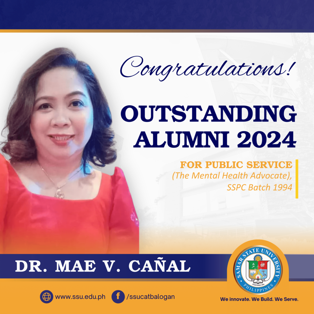 The second awardee is Dr. Mae V. Cañal who was recognized as the SSU Outstanding Alumna for Public Service. Dr. Cañal has devoted many years of service both in the academia and local communities as a professional teacher, guidance counselor, psychometrician, and psychologist. She leads various psychoeducational and psychosocial programs for the children and youth of Catbalogan City.