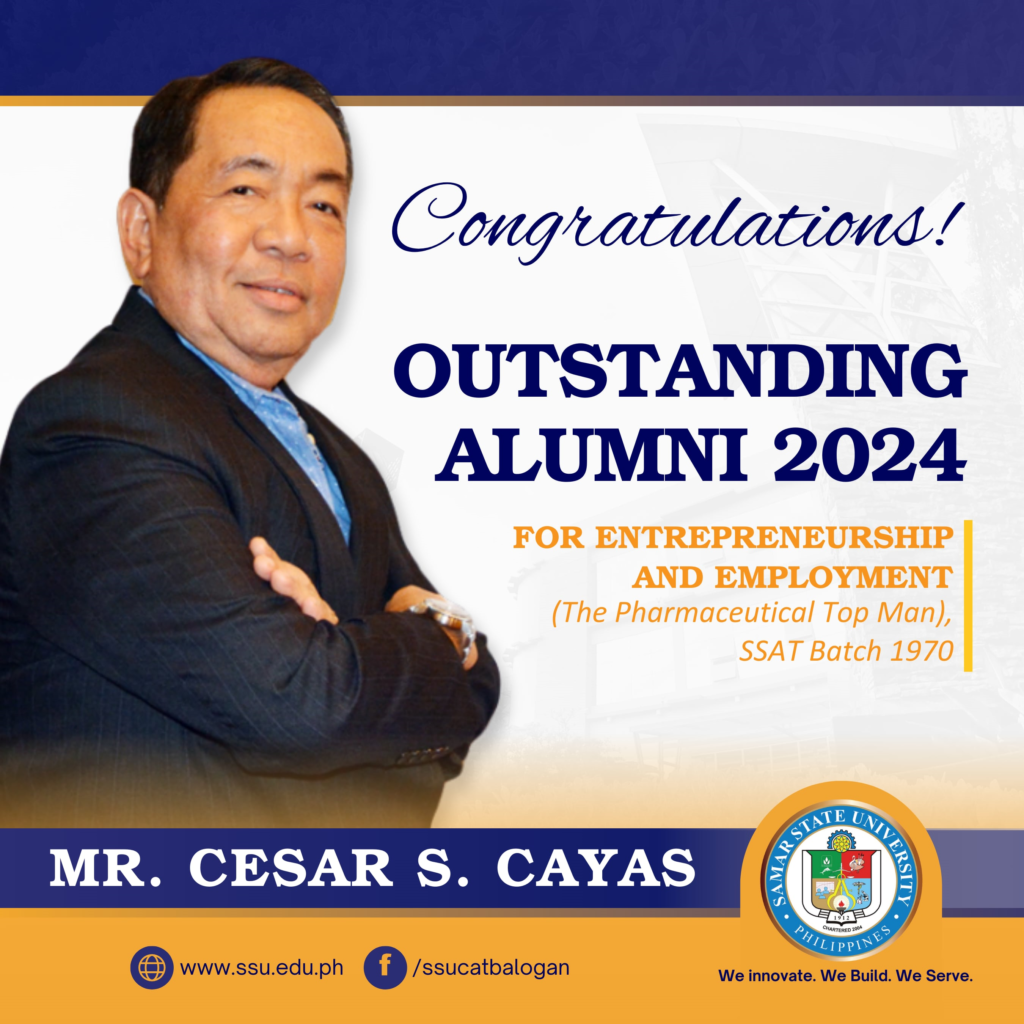 Mr. Cesar S. Cayas was hailed as the SSU Outstanding Alumnus for Entrepreneurship and Employment for his significant contributions to the healthcare sector. Mr. Cayas is the President and Chief Executive Officer (CEO) of CSGC Multi Marketing and Distribution Inc. (CSGC), as well as the Chief Operating Officer (COO) of the New Marketlink Pharmaceutical Corporation (NMPC). He currently serves as a Private Sector representative of the SSU Board of Regents (BOR), where he devotes his expertise to the establishment of the Samar Island Institute of Medicine (SIIM).
