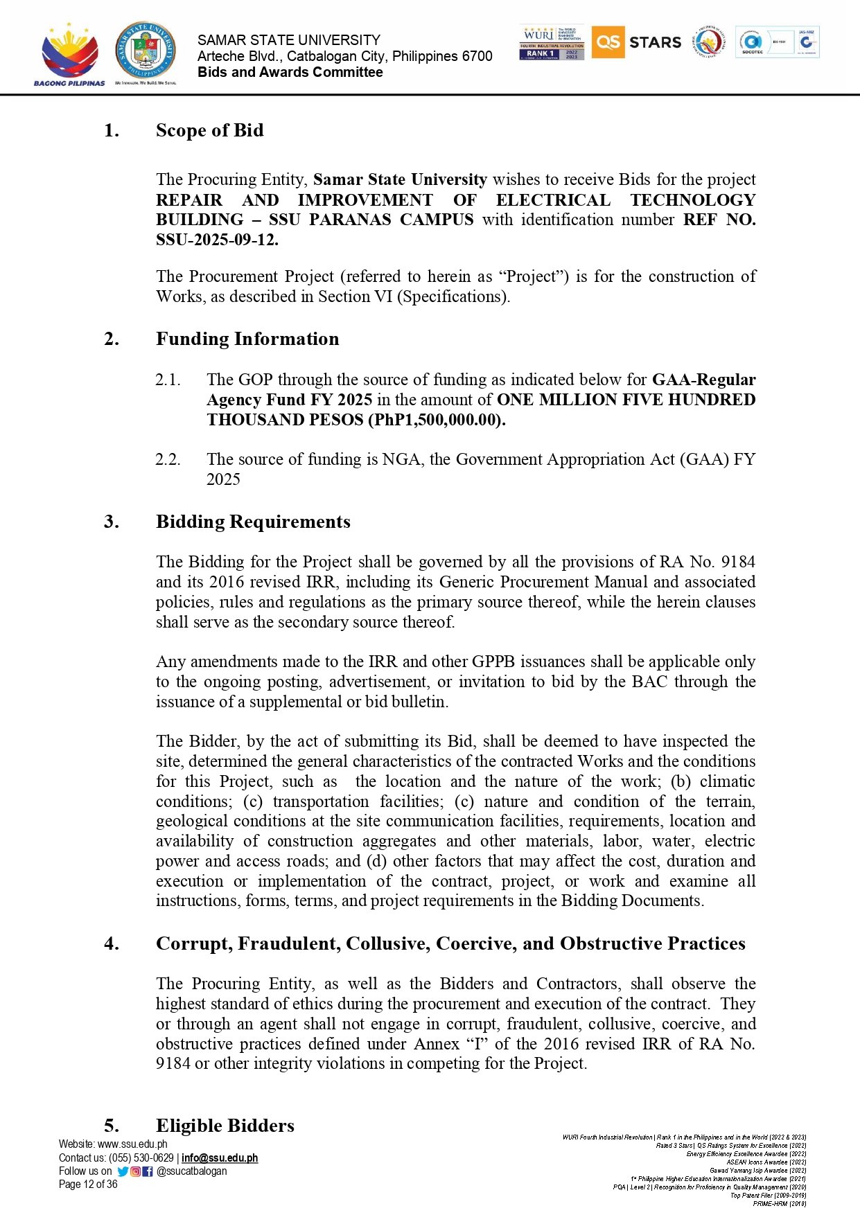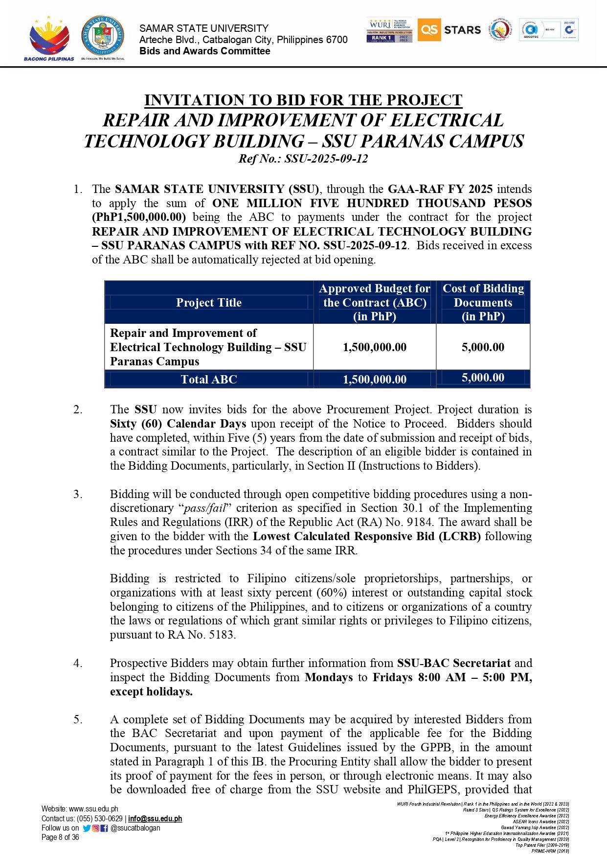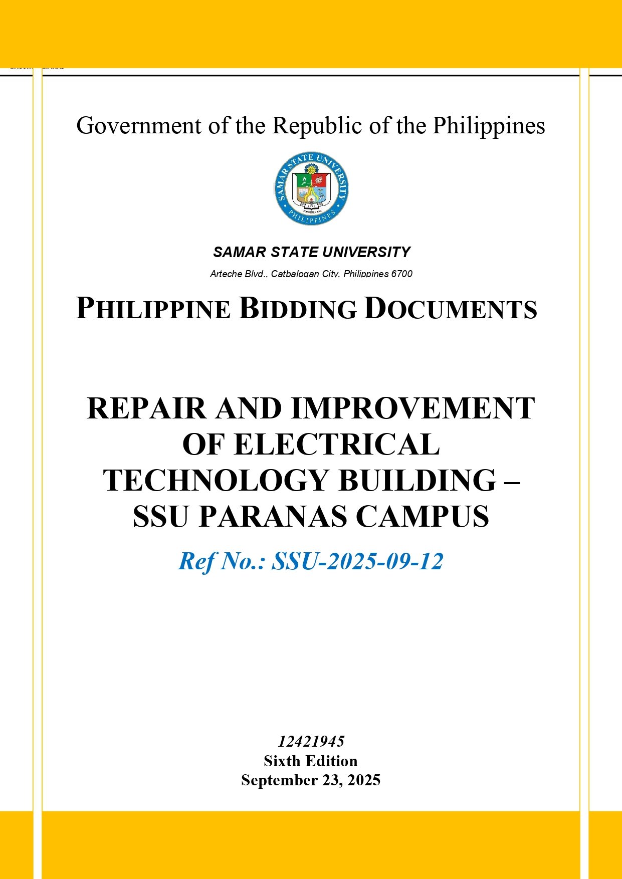 REPAIR AND IMPROVEMENT OF ELECTRICAL TECHNOLOGY BUILDING – SSU PARANAS CAMPUS Ref No.: SSU-2025-09-12By Admin / September 23, 2025