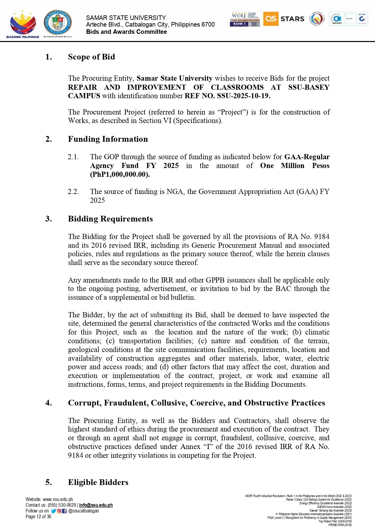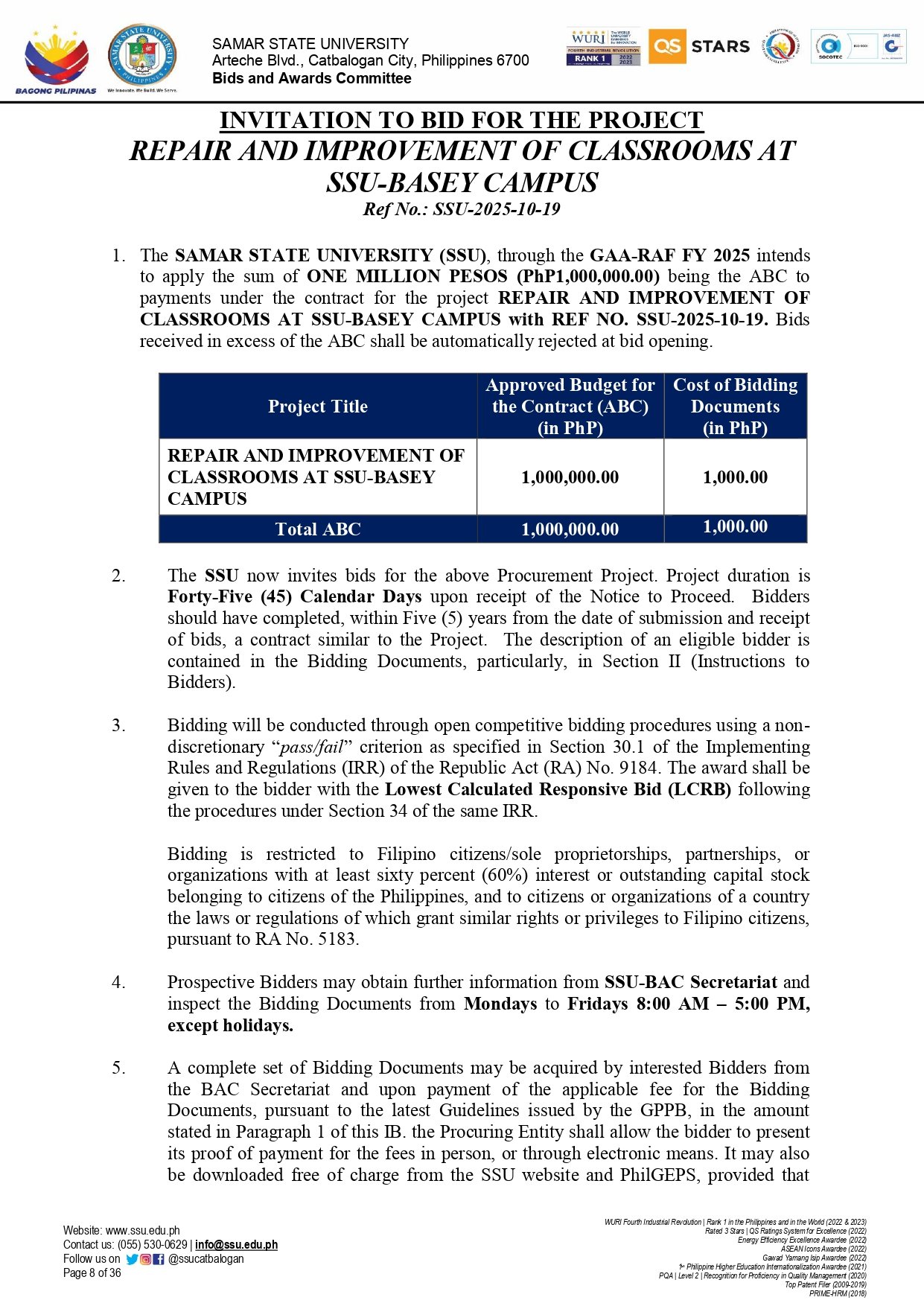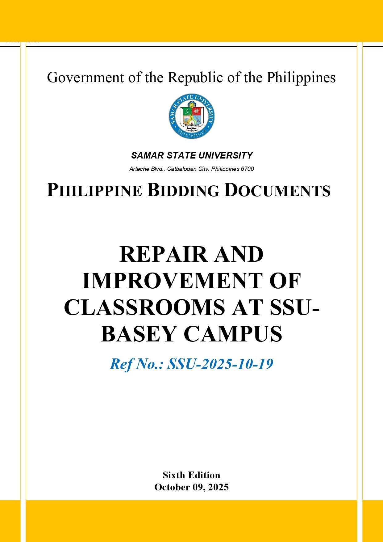 INVITATION TO BID FOR THE REPAIR AND IMPROVEMENT OF CLASSROOMS AT SSU-BASEY CAMPUS (Ref. No.: 2025-10-19)By Admin / October 9, 2025