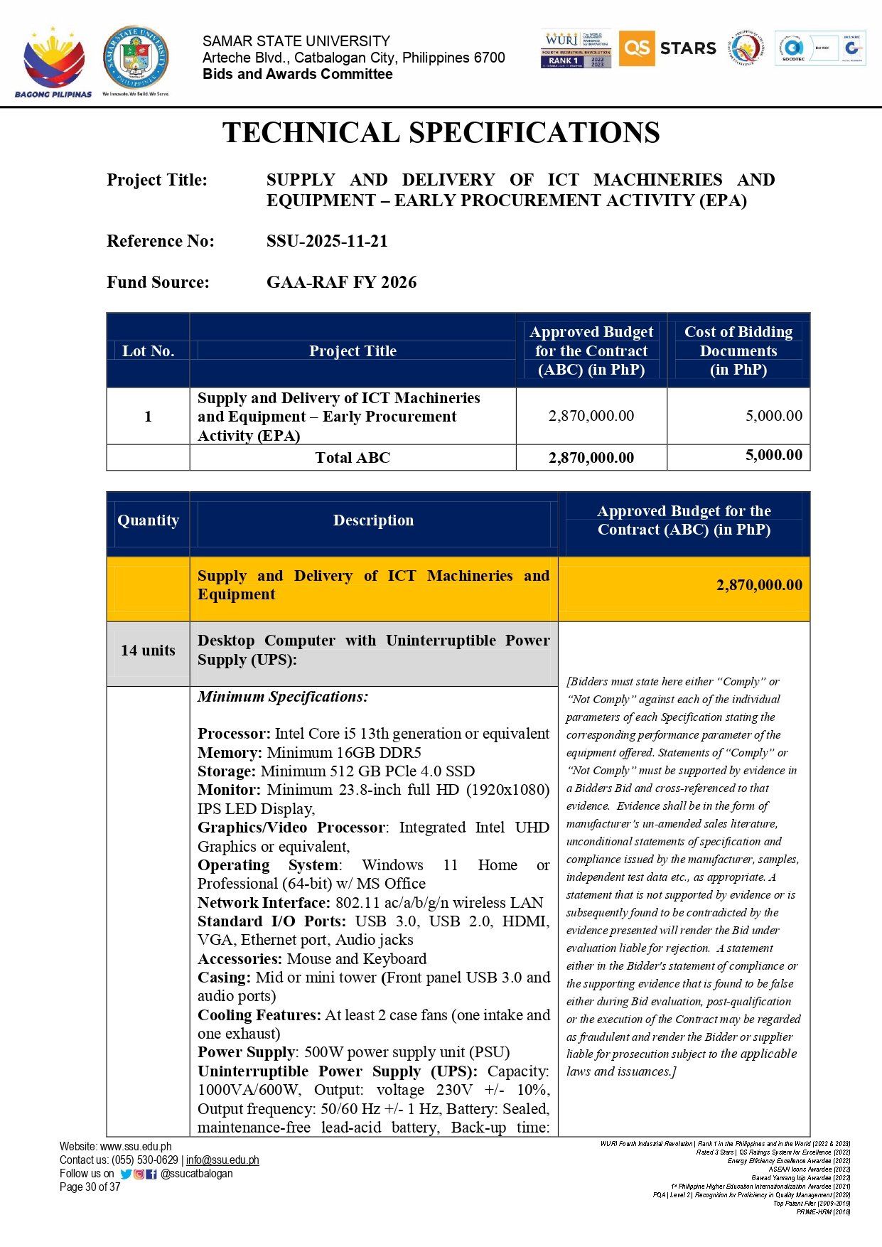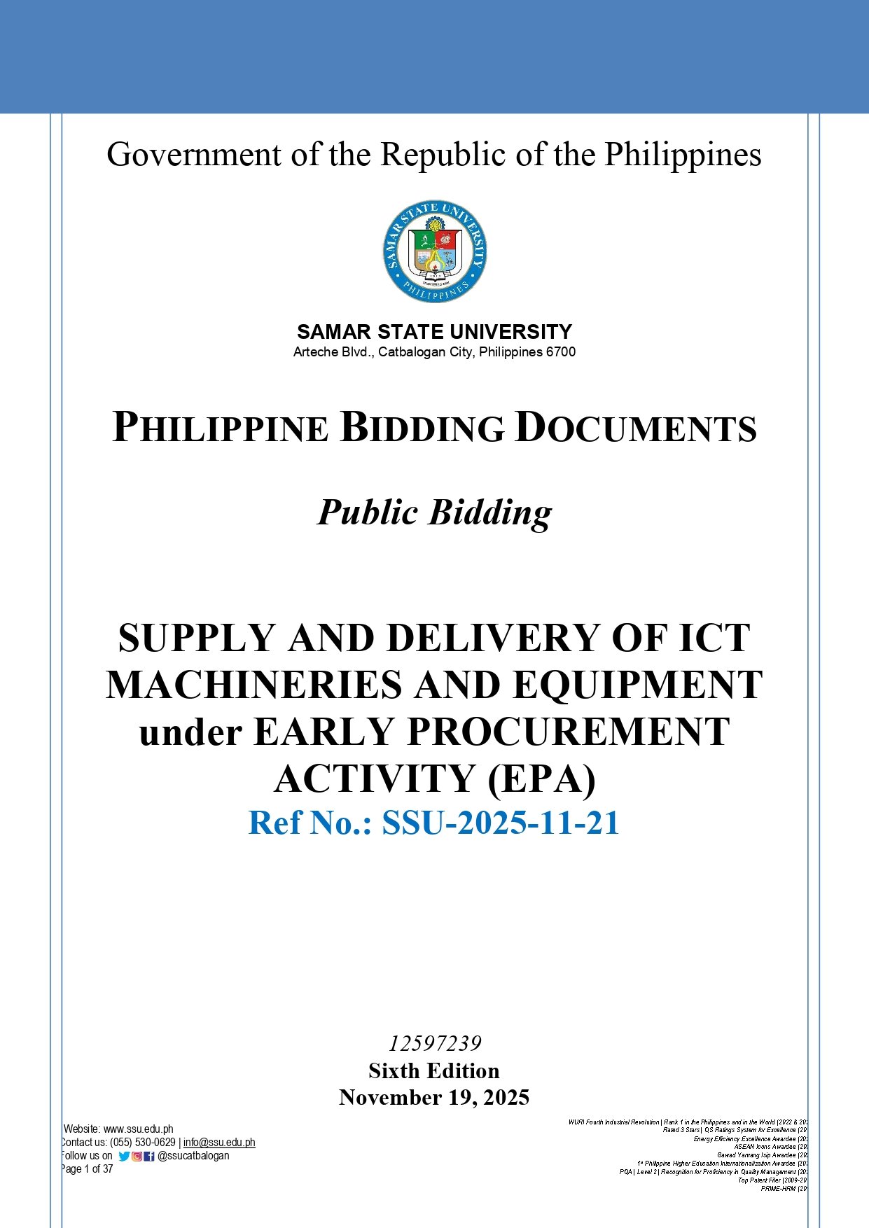 SUPPLEMENTAL BID BULLETIN (SBB) No. 11-12, s.2025: SUPPLY, DELIVERY AND INSTALLATION OF ICT MACHINERIES AND EQUIPMENT UNDER EARLY PROCUREMENT ACTIVITY (Ref. No.: SSU-2025-11-21)By Admin / November 21, 2025