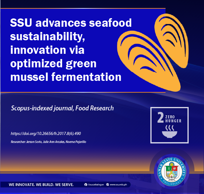 CATBALOGAN CITY, Philippines—Samar State University (SSU) supports the Sustainable Development Goal 2 (Zero Hunger) with the study, “Process optimization of salt-fermented green mussel (Perna viridis Linnaeus, 1758) using response surface methodology,” published in the Scopus-indexed journal, Food Research.